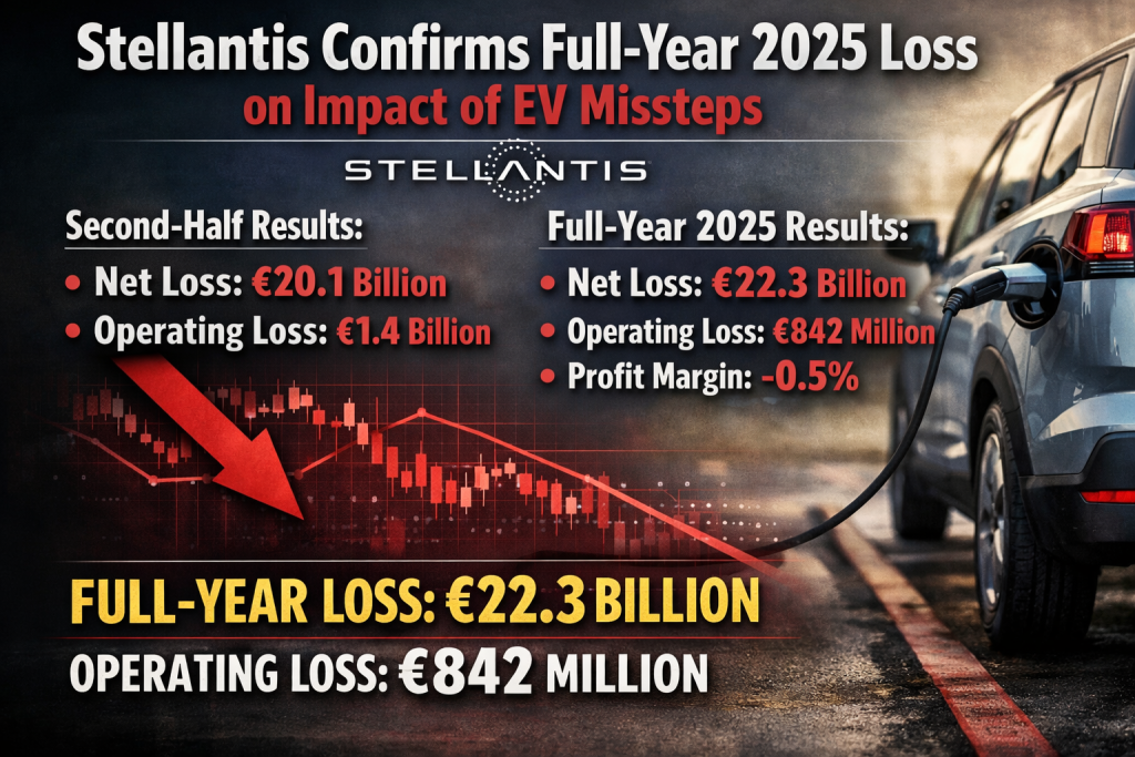 Stellantis posted a €22.3 billion net loss in 2025 amid EV-related write-downs and canceled models. CEO Antonio Filosa is scaling back electrification investments, with €6.5 billion in cash payments expected through 2026, while forecasting modest revenue growth and low operating margins in 2026.