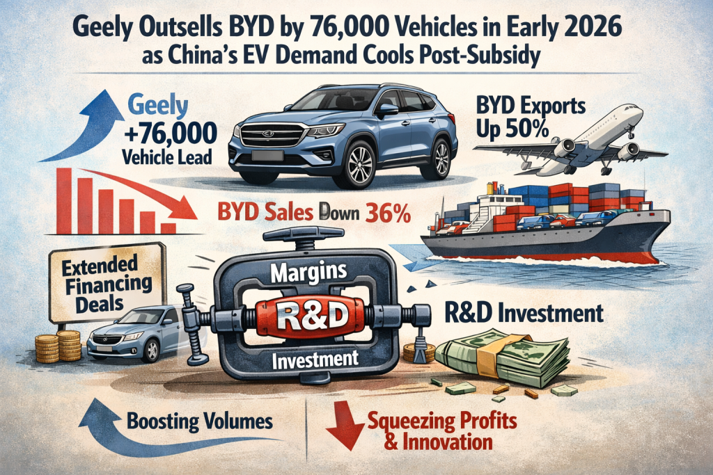Geely outsold BYD by 76,000 vehicles in early 2026 as China’s EV demand cooled post-subsidy. BYD shipments fell 36%, though exports rose over 50%. Extended financing may support volumes but risks squeezing margins and diverting R&D investment.