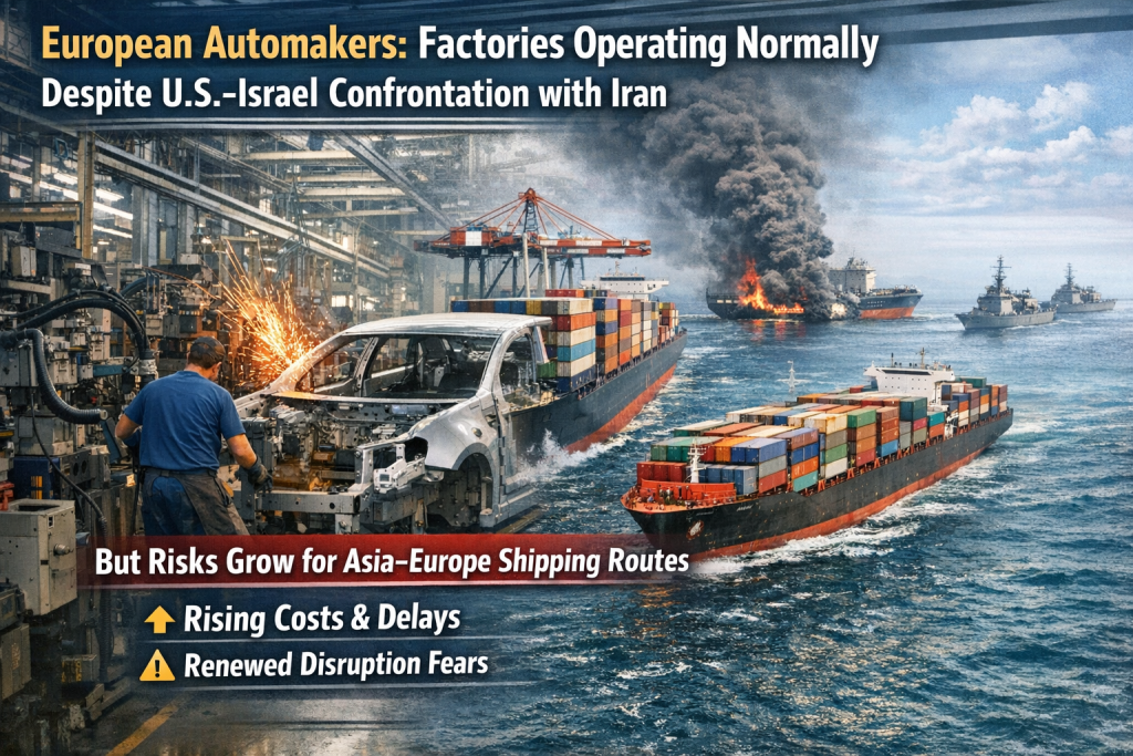 European carmakers report normal production but warn Iran conflict is disrupting Asia–Europe shipping lanes, forcing reroutes and higher safety stocks or premium freight. One automaker relies on 2–3 weeks’ buffers; contingency routing has lifted logistics costs ~40%. Maersk and Hapag-Lloyd divert around Africa, adding 10–15 days and higher insurance.