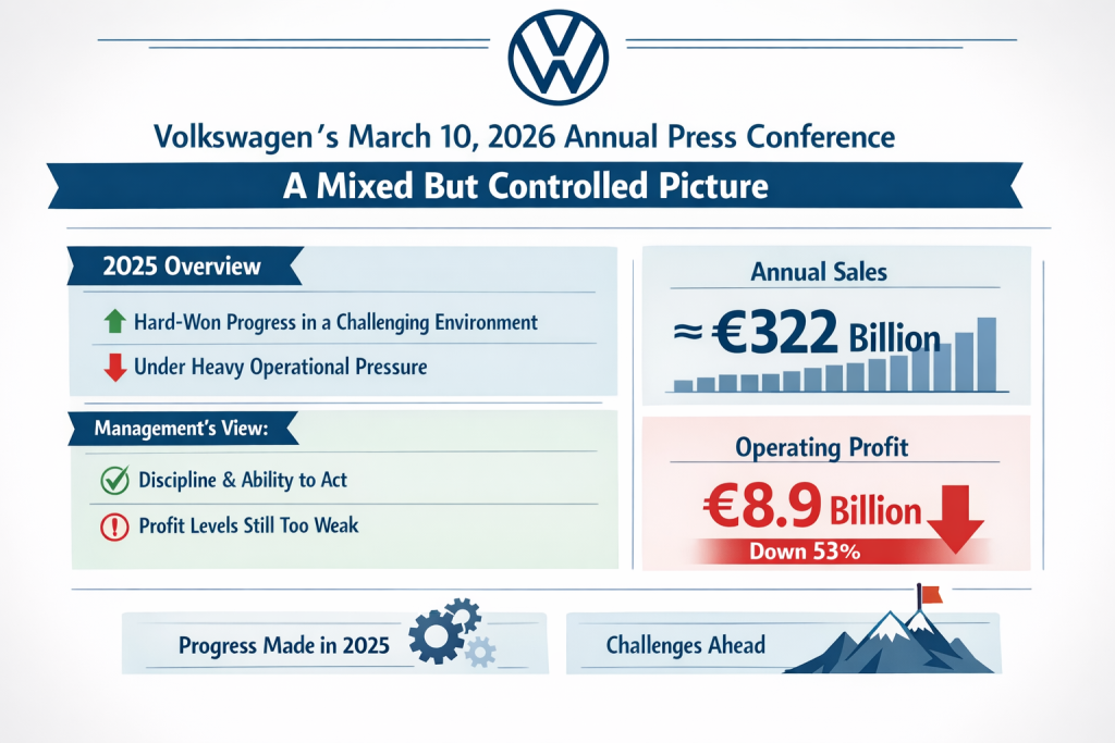Volkswagen’s results show resilience but heavy strain: sales held near €322 billion, profit halved to €8.9 billion, and margins remain too weak for its transformation. Cash flow discipline improved, core brands progressed unevenly, and 2026 guidance stays cautious while waiting for stronger contributions from 2027.
