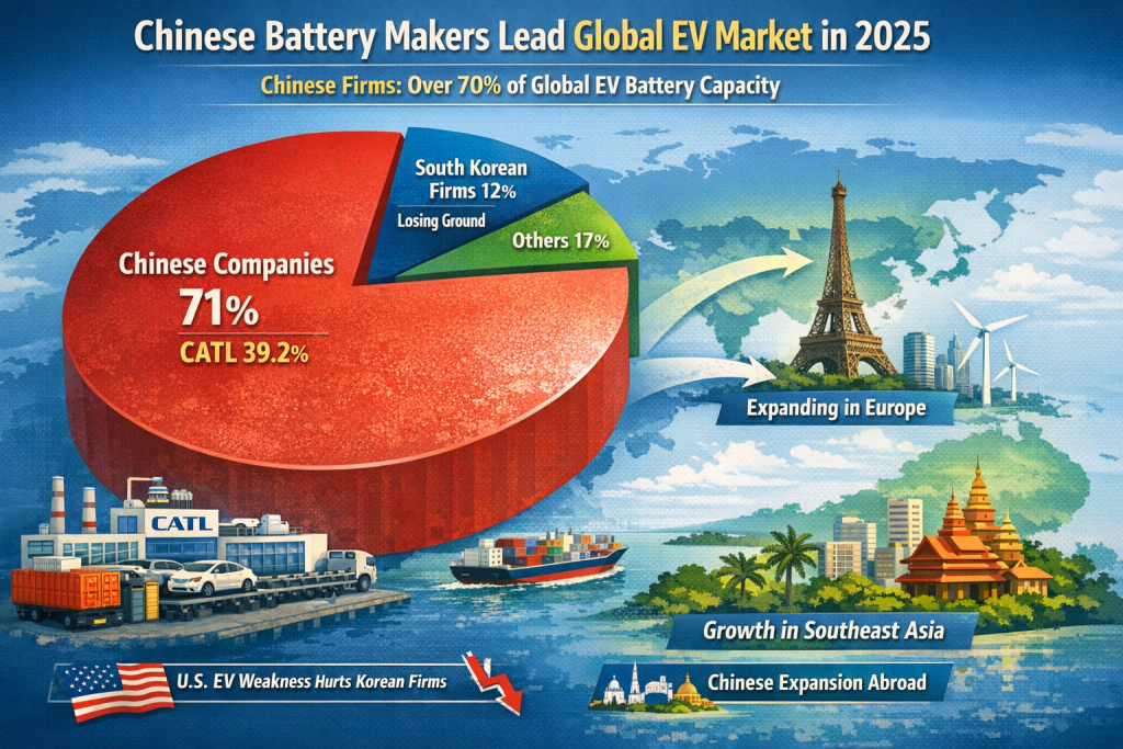 Chinese battery makers exceeded 70% of global installed EV battery capacity in 2025, led by CATL at 39.2%. South Korean rivals lost ground amid U.S. EV weakness, while Chinese groups expanded abroad, especially in Europe and Southeast Asia.