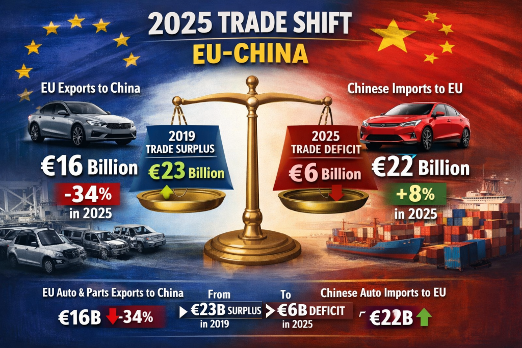 Chinese automotive imports into the EU exceeded EU vehicle and parts exports to China for the first time in 2025, reversing a €23 billion surplus in 2019 into a €6 billion deficit. Germany was hit particularly hard, with exports to China sharply down and sector employment continuing to decline.
